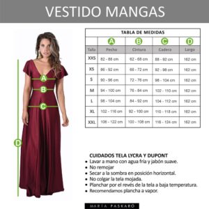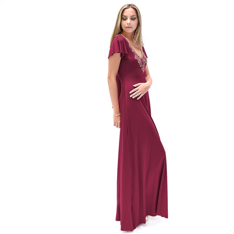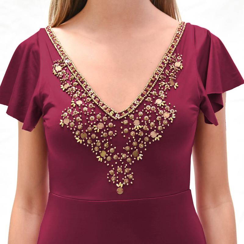 Vestido Largo Mangas Burdeo Lycra Lazo Espalda Bordado A Mano Maria Paskaro
