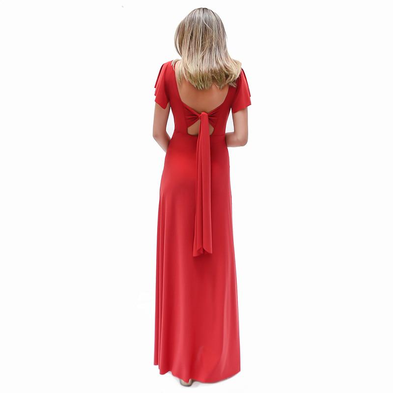 Vestido Largo Mangas Rojo Italiano Lycra Lazo Espalda Bordado A Mano Maria Paskaro
