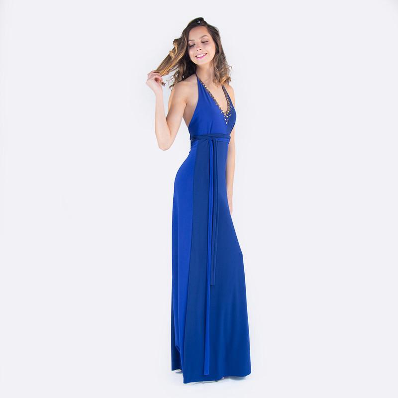 Vestido Largo Merida Azul Lycra Bordado A Mano Maria Paskaro